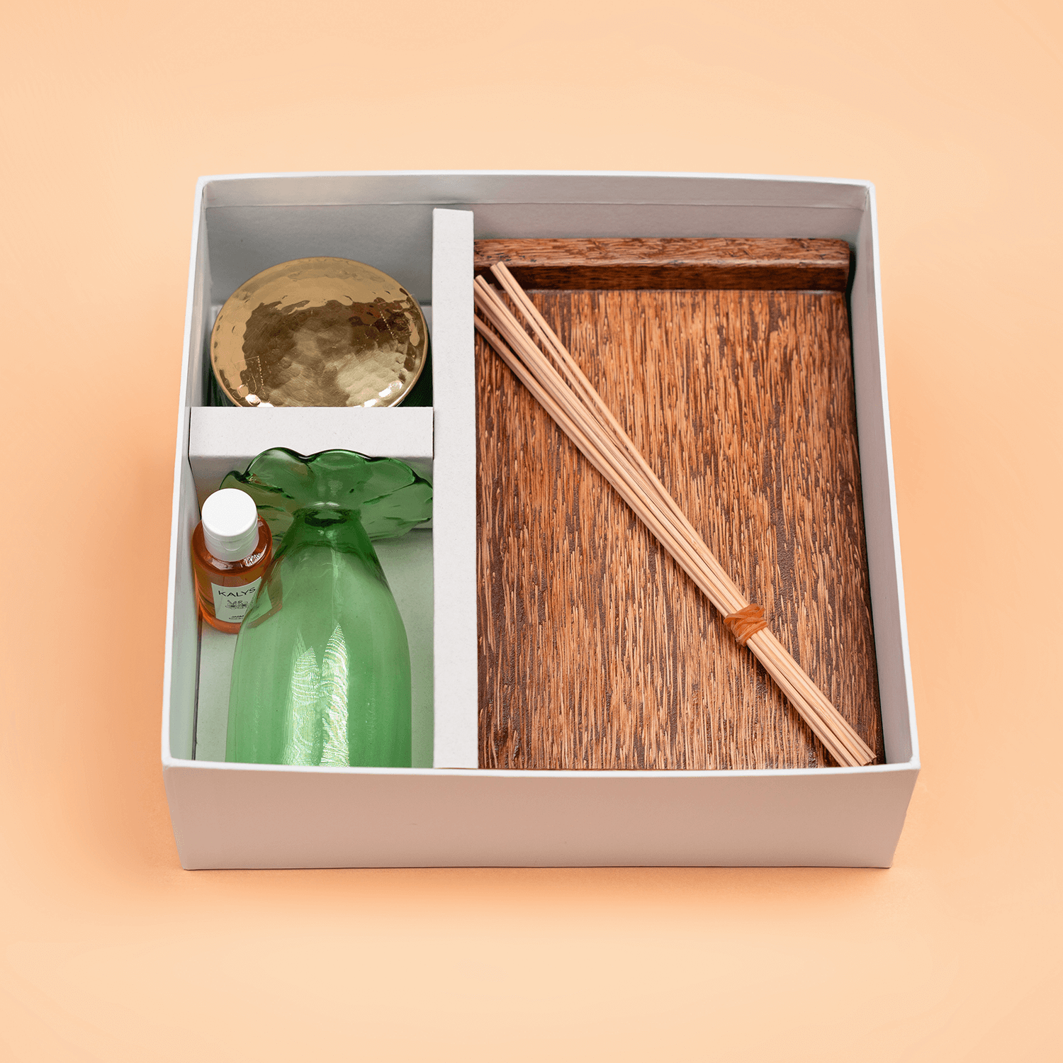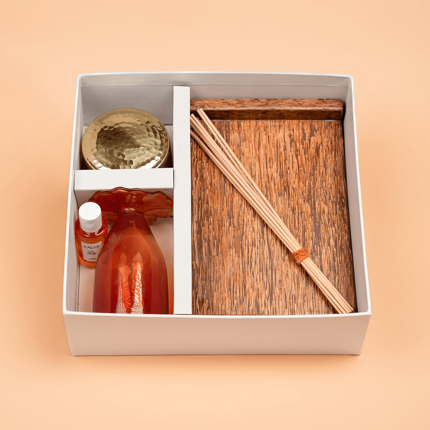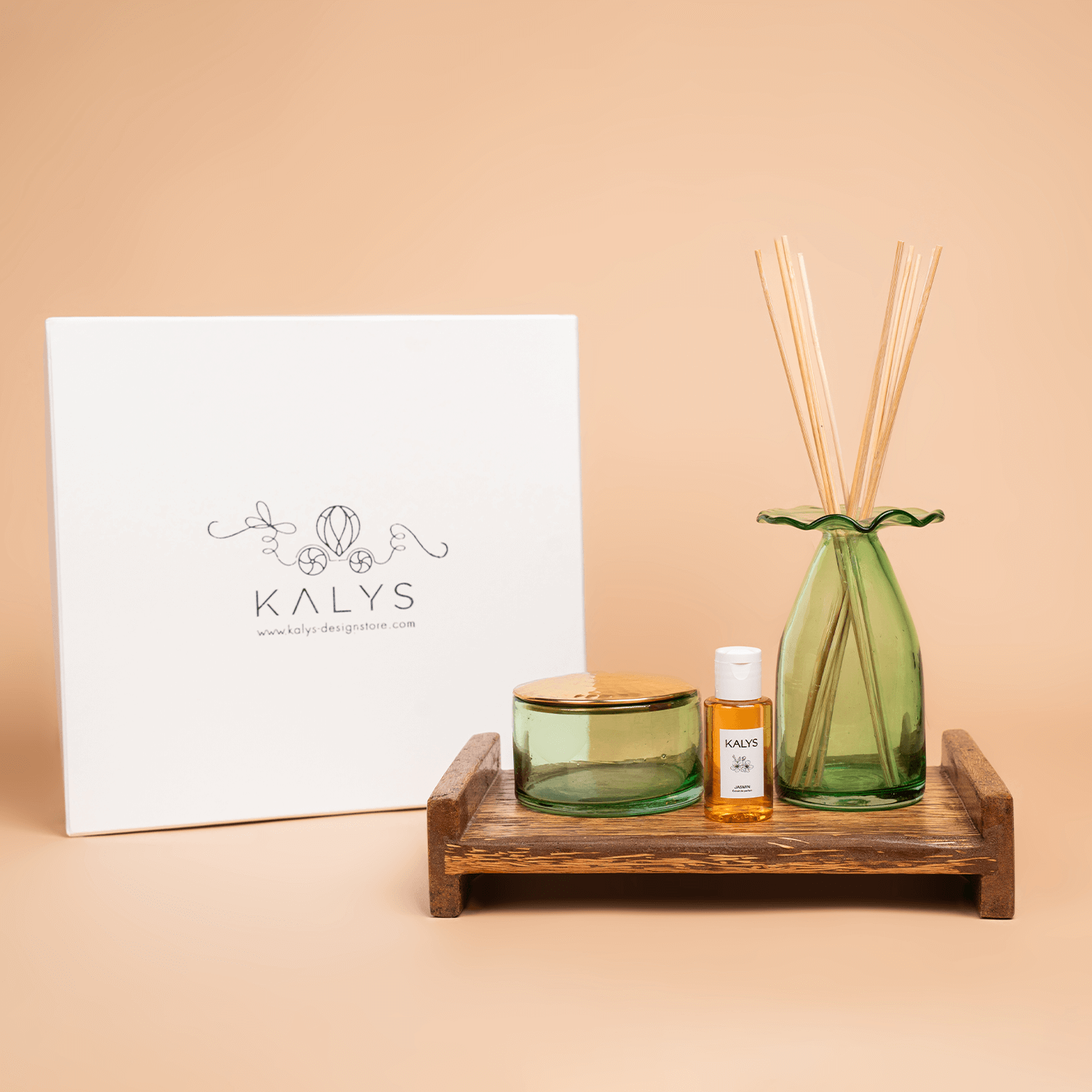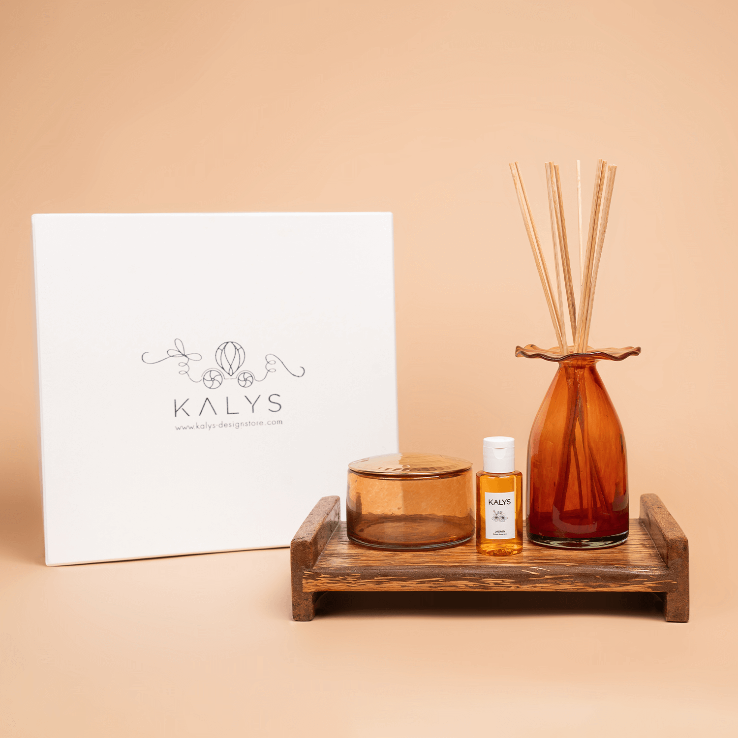 Chaque élément du coffret témoigne de l'expertise de différents artisans : le diffuseur Zouhour en verre soufflé, avec sa fleur sculptée à la main, est l'œuvre de souffleurs de verre maîtrisant une technique ancestrale. La bonbonnière en verre soufflé, ornée d’un couvercle en cuivre martelé et le plateau en bois de palmier recyclé de la région de Douz créent ensemble une harmonie parfaite.