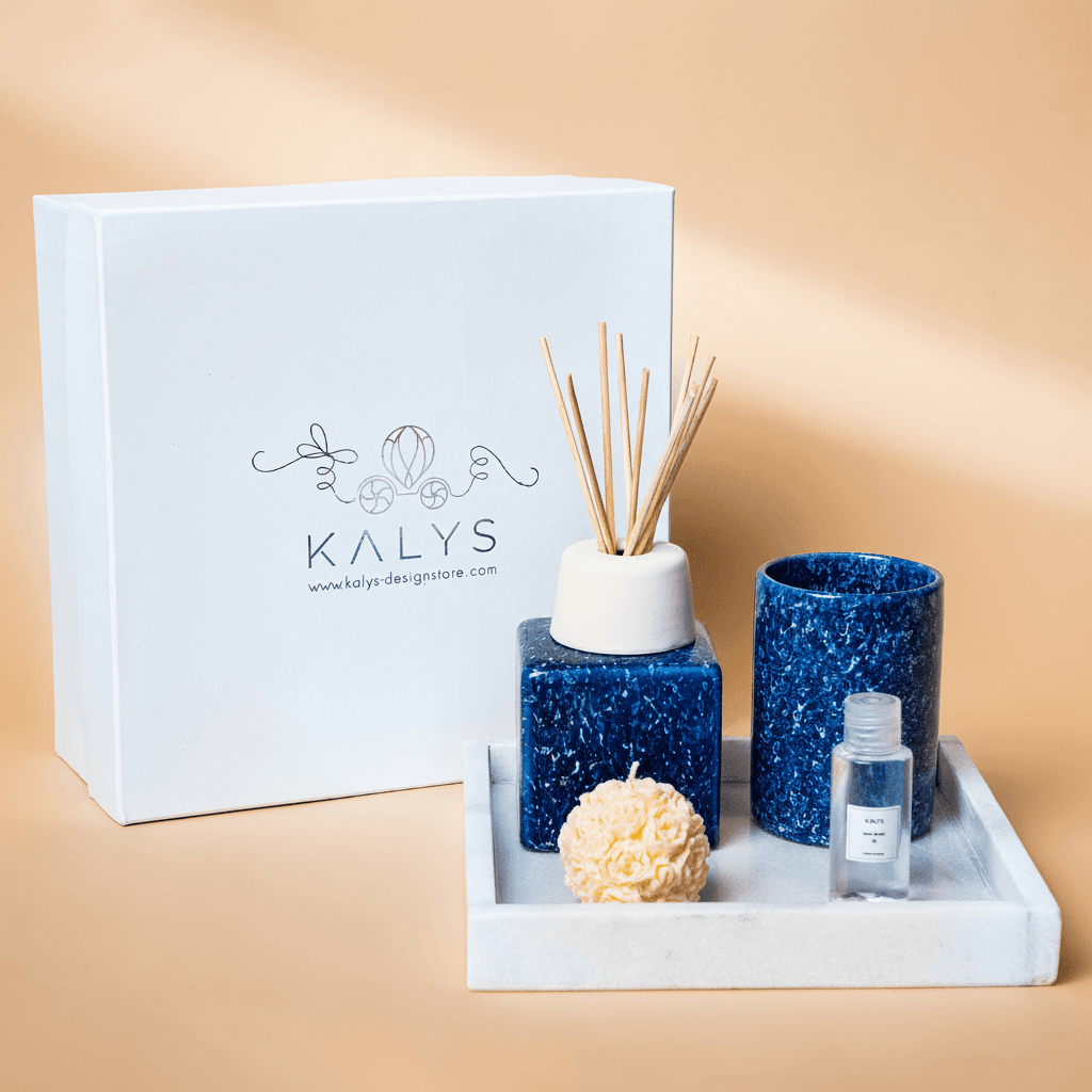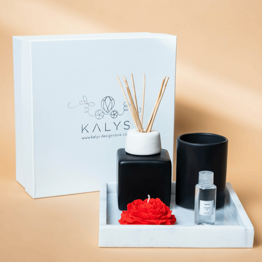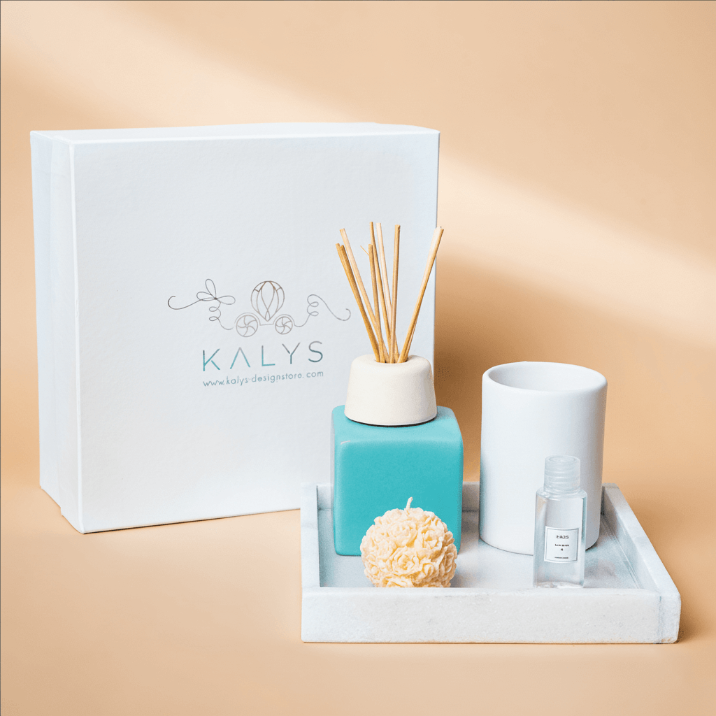 Le pack prestige carré comporte un diffuseur de parfum en forme de cube , un gobelet en céramique, une fiole à parfum de 30ml,une bougie fleur parfumée et un plateau en marbre carré